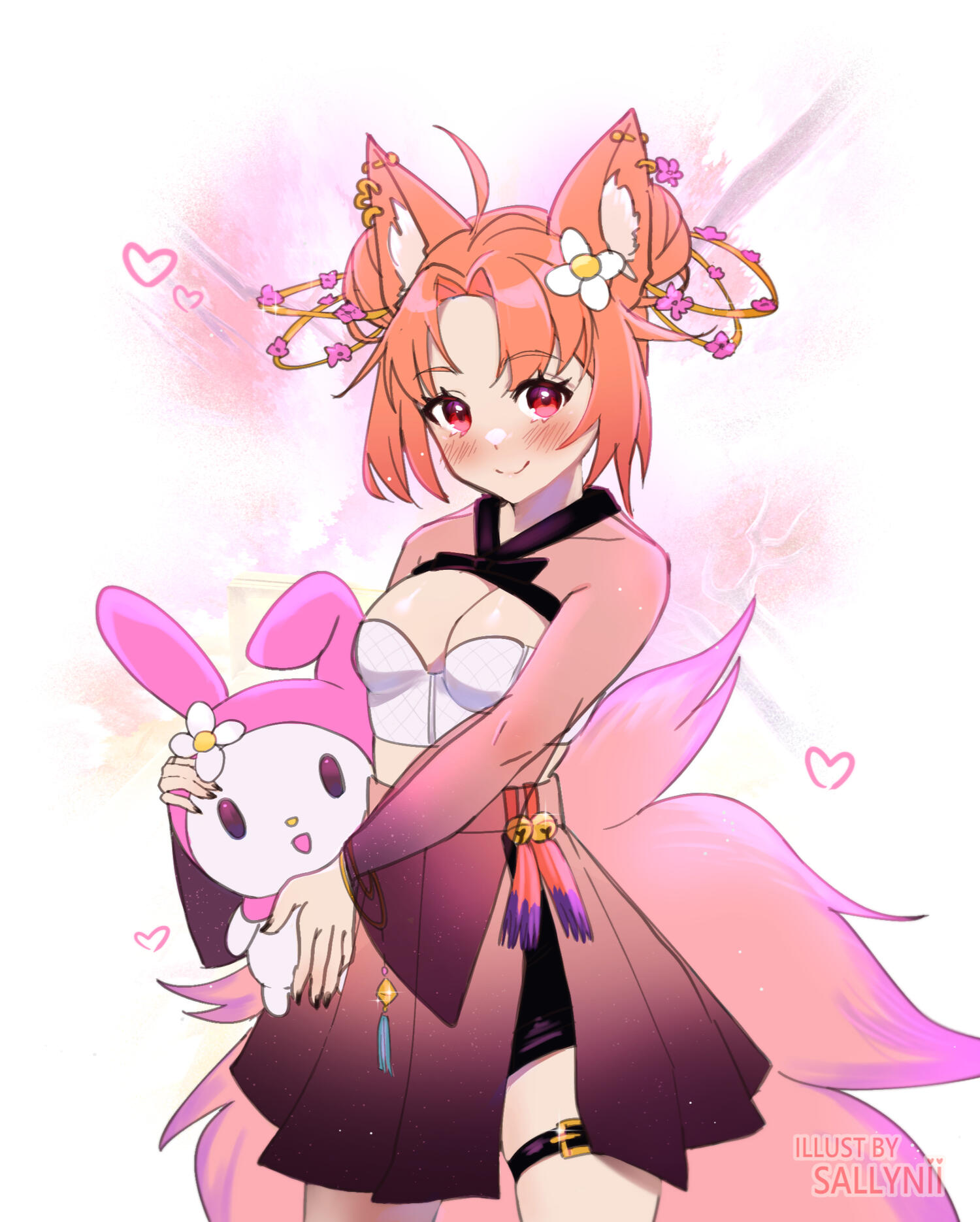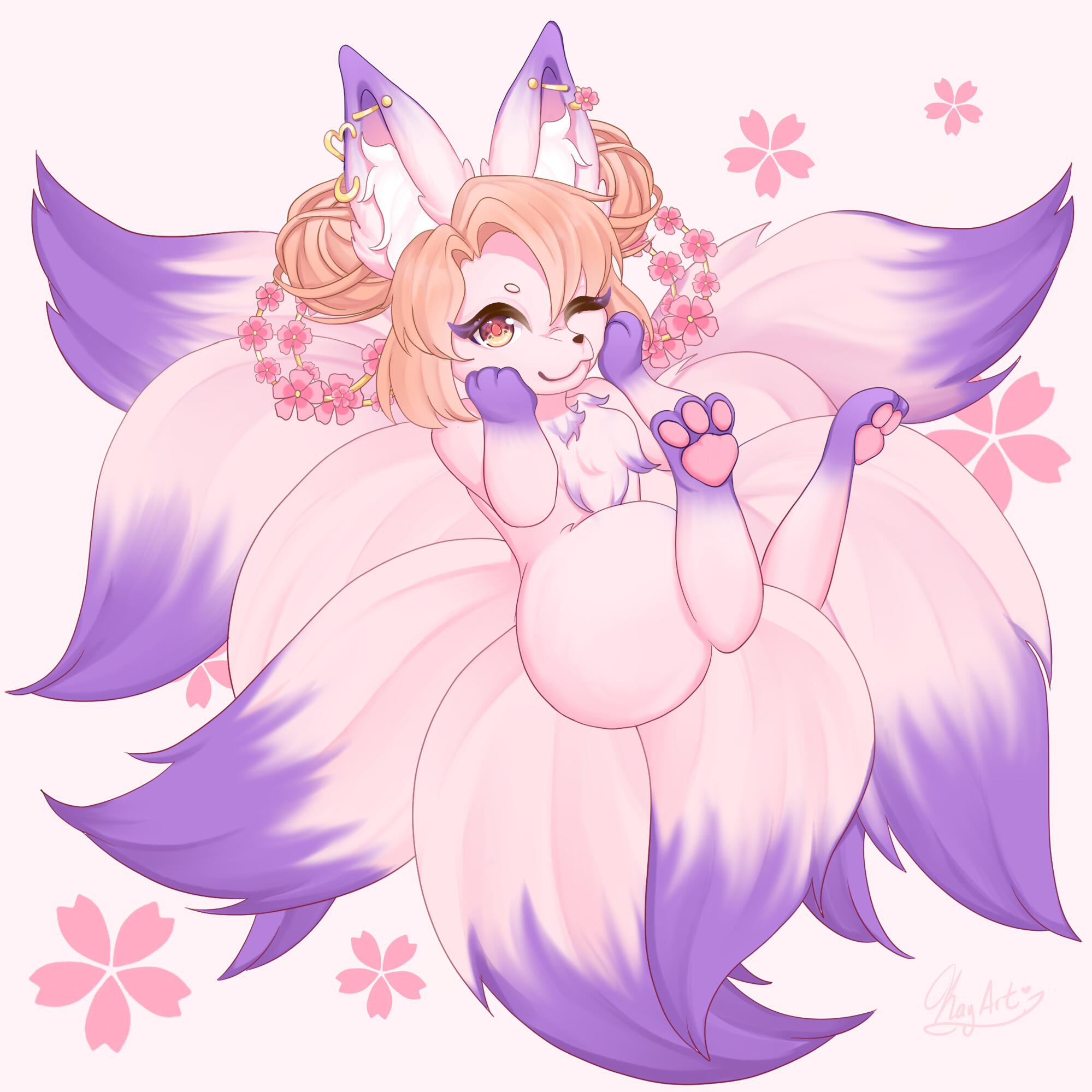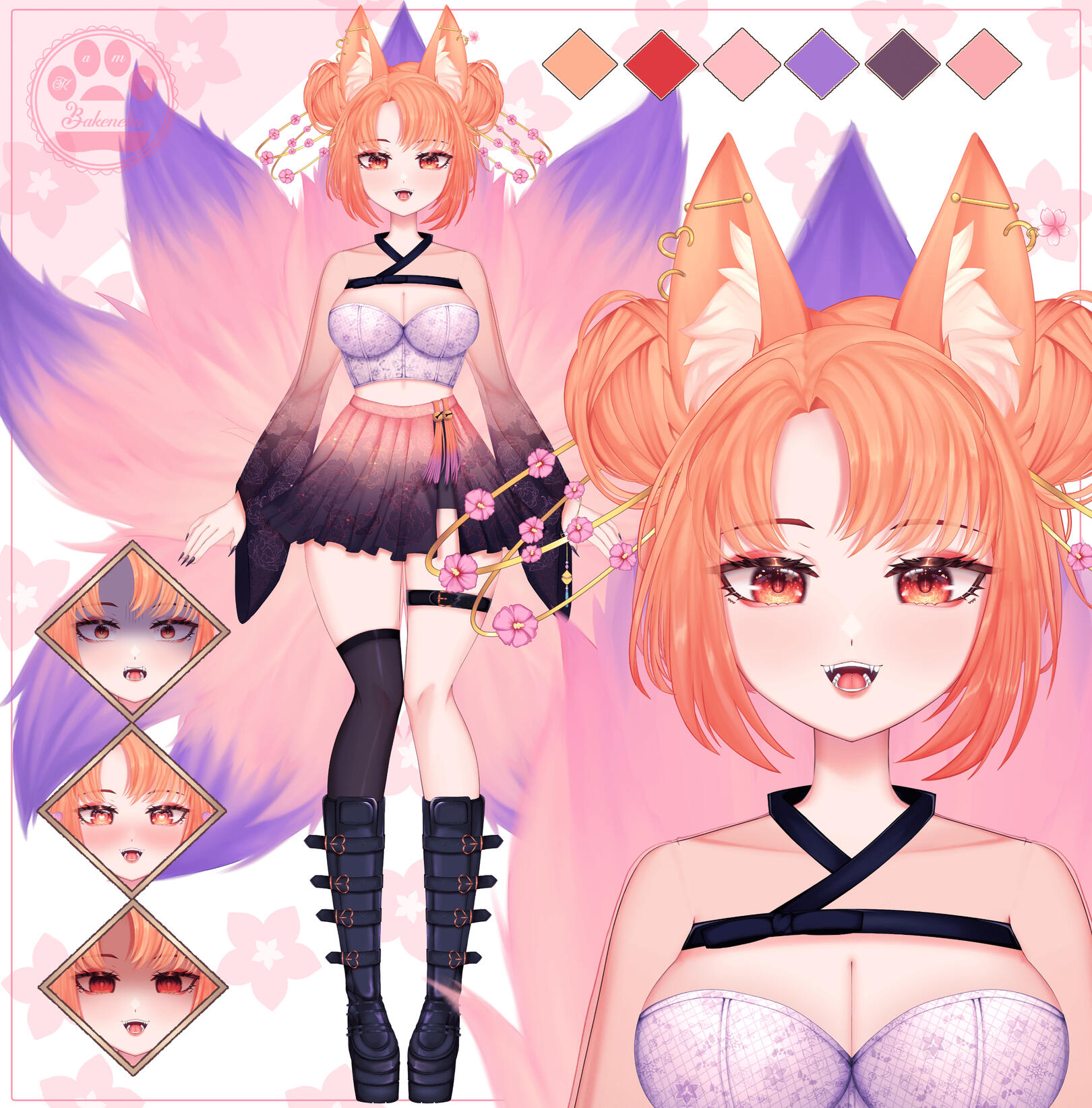 Gumiho con nueve colas de tonos púrpura y rosa brillante. Luce un peinado de dos moñitos con cabello naranja suave, decorado con flores en listones dorados. Sus ojos, intensos y felinos, combinan con colmillos visibles que le dan un toque juguetón. Viste un top blanco con encaje brillante con una falda degradada en tonos oscuros y mangas transparentes, debajo lleva un short complementado con medias altas y botas negras con hebillas.